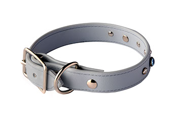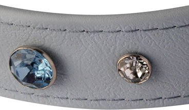 1 inch light blue faux leather with blue and clear crystals, stainless steel buckle and D ring.