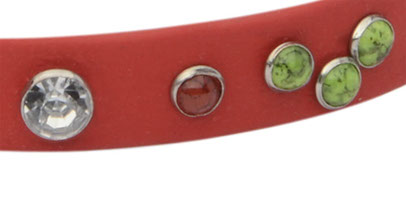 1/2 inch wide, red faux leather with red, green and clear crystal stones, stainless steel buckle and D ring.