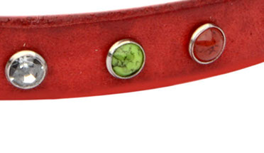 1/2 inch wide, red leather with red, green and clear crystal stones, stainless steel buckle and D ring.