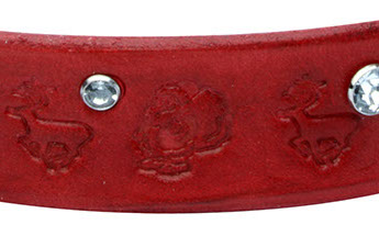1 inch red leather with embossed Santa and reindeer with clear crystals, stainless steel buckle and D ring.