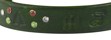 1 inch green leather with embossed Christmas tree, present and Christmas stocking with red, green and clear crystals, brass buckle and D ring.