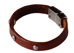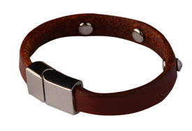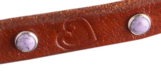 3/8 inch wide, light brown leather with embossed hearts and light purple stones. Clasp slides together and stays secure with magnet. Screws keep leather firmly attached to clasp.