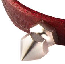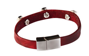 3/8 inch wide, dark red leather with spikes and embossing. Clasp slides together and stays secure with magnet. Screws keep leather firmly attached to clasp.